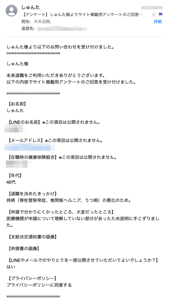 しゅんたさんは、持病である「脊柱管狭窄症」「椎間板ヘルニア」「うつ病」の悪化が理由で退職を決意されたそうです。